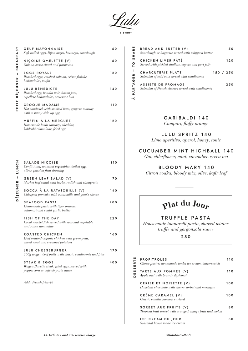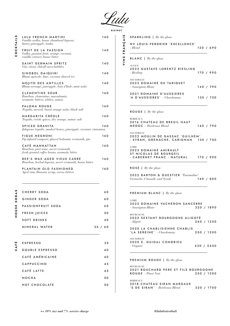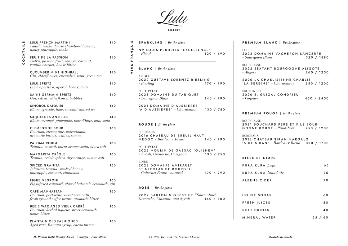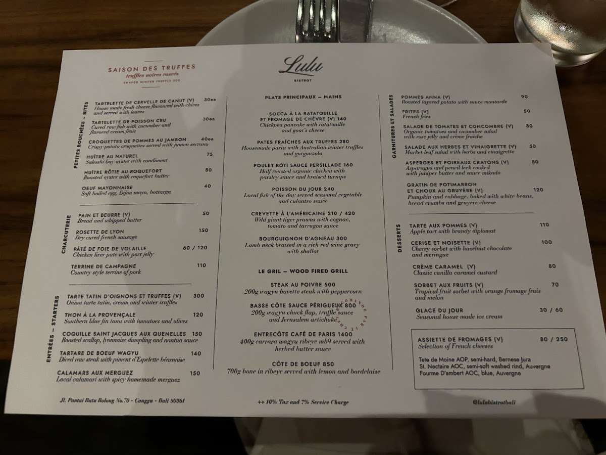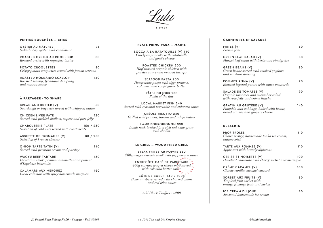 Lulu Bistrot French Restaurant Canggu offers an exquisite journey into French cuisine right in the vibrant heart of Bali. Nestled at Jl. Pantai Batu Bolong, this bistro combines modern elegance with a warm atmosphere, making it an ideal dining destination. The menu highlights include a range of shareable delights like the rich Chicken Liver Pâté paired with pickled shallots and the indulgent Charcuterie Plate featuring premium cold cuts.